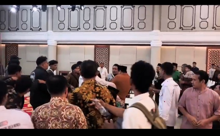 Situasi kemudian memanas dan terjadi aksi tarik-menarik serta dorong-mendorong di antara tamu undangan.